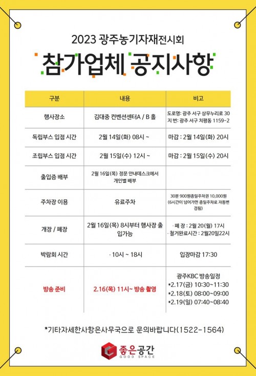 2023광주농기자재전시회 참가업체 공지사항 페이지 정보 작성자 국제농기자재전시회관리자 댓글 0건 조회 1,027회 작성일 23-02-10 16:31 본문 안녕하세요! 좋은공간입니다 ^^입점업체 공지사항을 올려드리오니참고하시기 바랍니다.부스배치도도 같이 올려드립니다 ^^감사합니다. 목록