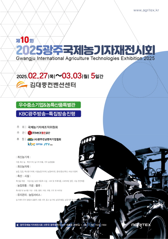 · 약칭 : AGRITEX2025개최기간 · 2025년 02월 27일(목) ~ 03월 03일(월) 5일간 장 소 · 광주광역시 김대중컨벤션센터 주 최 · 국제농기자재전시회 조직위원회 주 관 ·